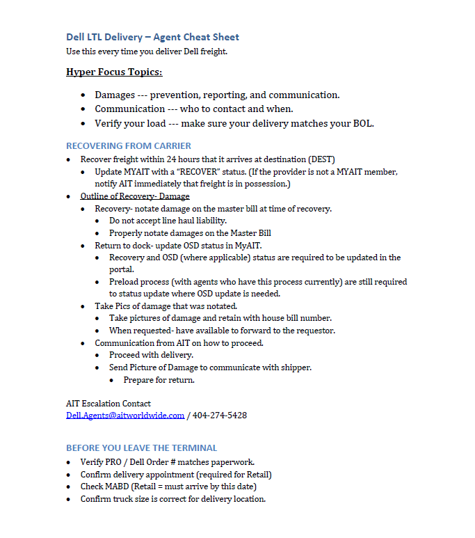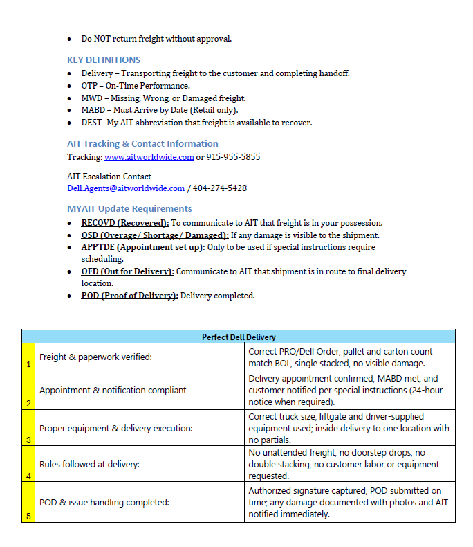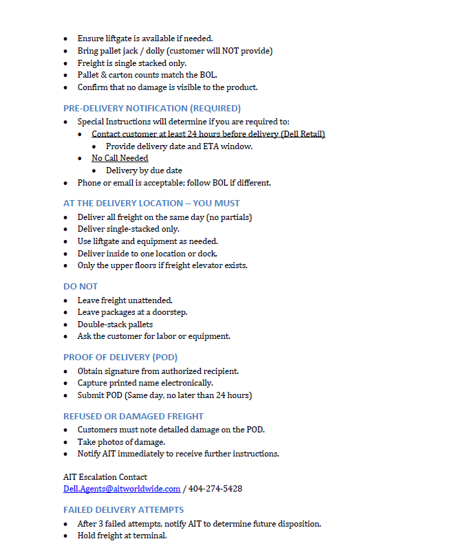 Dell continues to be a critical account for us, and perfect execution on every delivery is expected. The attached Dell Document is your go‑to SOP for handling Dell freight from recovery through POD submission.